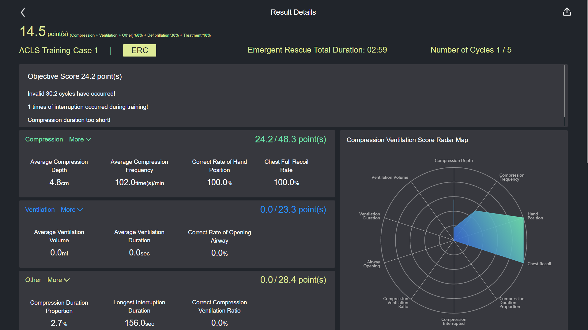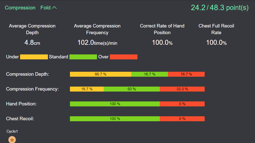 13)     Details of a training result can be viewed, including total score, total duration and number of cycles; compression score, average compression depth, average compression rate, accuracy of compression position, full recoil rate; ventilation score, average ventilation volume, average ventilation duration, airway opening accuracy; compression duration as a percentage of the total CPR duration, maximum interruption duration