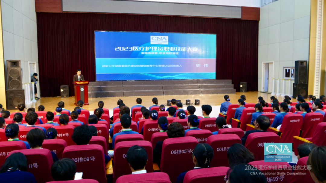 國家衛(wèi)生健康委能力建設和繼續(xù)教育中心資格認證處負責人周偉,滄州醫(yī)學高等??茖W校黨委書記劉健,大賽組委會副主任、執(zhí)委會主任高澍蘋,大賽執(zhí)委會副主任、工作組組長、北京百洋健康職業(yè)學校校長劉則楊,北京護理學會理事長張洪君,大賽執(zhí)委會副主任、裁判長周嫣,滄州市衛(wèi)生健康委員會副主任胡尚友,滄州醫(yī)學高等專科學校黨委委員、副校長王衍,天津天堰科技股份有限公司監(jiān)事會主席、工會主席王志永,慧醫(yī)(天津)教育科技有限公司董事長徐盛慧等領導和專家出席開幕式,裁判團,參賽團隊院校領隊、指導老師及參賽選手共計400余人參加開幕式。